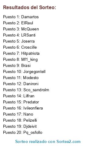 Lista de participantes: Modesto, Lilfran, Mf1_king, Damartos, Jorgegontell, Predator, McQueen, ElRaul, Pelizelli, Sco_sandrolm, Djdeivit, Joserra, Pq_osfollo, LRSanti, Brasi, Ivileonfiera, Croscille, Nano, Danironi, Hitpatriota.