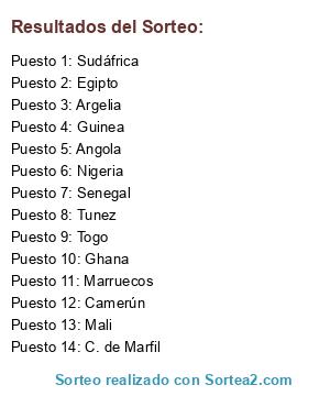 Lista de participantes: Angola, Camerún, C. de Marfil, Egipto, Ghana, Guinea, Mali, Marruecos, Nigeria, Senegal, Sudáfrica, Togo, Tunez, Argelia.