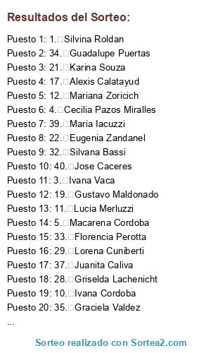 Lista de participantes: 1. Silvina Roldan, 2. Maria Jose Alvarez Lamonaca, 3. Ivana Vaca, 4. Cecilia Pazos Miralles, 5. Macarena Cordoba, 6. Maria Laura Lopez, 7. Caro Audo Gianotti, 8. Sil Herrera, 9. Josefina Gonzalez, 10. Ivana Cordoba, 11. Lucia Merluzzi, 12. Mariana Zoricich, 13. Maria Laura Soto, 14. Veronica Mendizabal, 15. Cecilia Roldan, 16. Yanina Maldonado, 17. Alexis Calatayud, 18. Gisella Moreno, 19. Gustavo Maldonado, 20. Marianela Vaca, 21. Karina Souza, 22. Eugenia Zandanel, 23. Margarita Dandrea, 24. Paula Saul, 25. Mer Querio, 26. Veronica Dagum, 27. Marta Alicia Suarez, 28. Griselda Lachenicht, 29. Lorena Cuniberti, 30. Rosario Day, 31. Andrea Paola Bassi, 32. Silvana Bassi, 33. Florencia Perotta, 34. Guadalupe Puertas, 35. Graciela Valdez, 36. Lore Ortega, 37. Juanita Caliva, 38. Pimpi Briones Robles, 39. Maria Iacuzzi, 40. Jose Caceres, 41. Florencia Calabresi, .