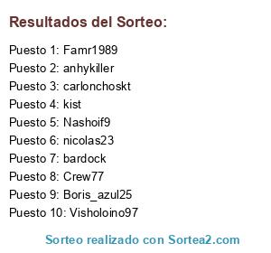 Lista de participantes: kist, bardock, Famr1989, Nashoif9, Boris_azul25, anhykiller, Crew77, Visholoino97, carlonchoskt, nicolas23.