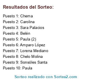 Lista de participantes: Carolina, Virginia, Chelo Molina, Sara Rodrigo, Paula, Lorena Mediano, Paula (2), Belén , Lara, Chema, Mónica Palomero, Esther Piñeros, Amparo López, Sara Palacios, Kari, Esther Nadales, Pilar, Óscar, Sonsóles Santa, Ane, Rakell, Patricia Cano, Carmen Segura, Karina Girasol, .