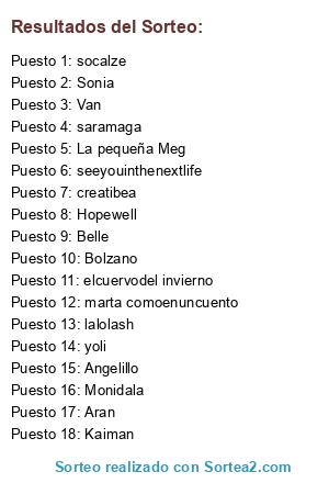Lista de participantes: seeyouinthenextlife, yoli, marta comoenuncuento, saramaga, creatibea, lalolash, Aran, Kaiman, La pequeña Meg, Van, Bolzano, Hopewell, Sonia, socalze, Belle, elcuervodel invierno, Monidala, Angelillo.