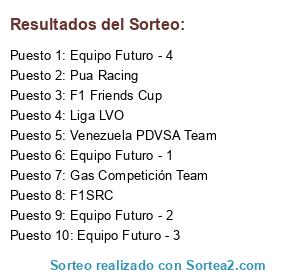 Lista de participantes: Venezuela PDVSA Team, Liga LVO, Gas Competición Team, Pua Racing, F1SRC, F1 Friends Cup, Equipo Futuro - 1, Equipo Futuro - 2, Equipo Futuro - 3, Equipo Futuro - 4.