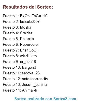Lista de participantes: er_oze18 , Peperecre , Animal-b , Moska , wladi_kito , B4s1CoOl , belcebu007 , Staider , Pelopito, sotoahorroscity , Josem_uchiha , serova_23 , bargon3 , ExOn_ToGa_10.
