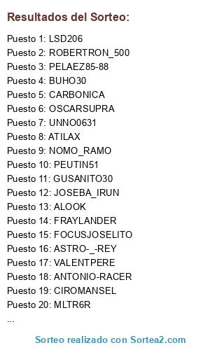 Lista de participantes: ASTRO-_-REY, CARBONICA, TELDEMER, VALENTPERE, GUSANITO30, BUHO30, RANRANRAN59, CIROMANSEL, ANTONIO-RACER, FOCUSJOSELITO, PEUTIN51, OSCARSUPRA, ROBERTRON_500, MLTR6R, NOMO_RAMO, JOSEBA_IRUN, LSD206, PELAEZ85-88, ATILAX, FRAYLANDER, ALOOK, UNNO0631.
