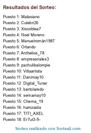 Lista de participantes: empresariales3, Culebri26, bertolaredo, Xiscoblea7, semamay10, pachulibalompie, Digital_Tuner, Chema_19, Danimay10, Villaartista, Er7ut3-9-, Manuelromán1987, hamzaida, TITI_AXEL, Malasiano, Anthelios_78, Noel Moreno, Orlando.