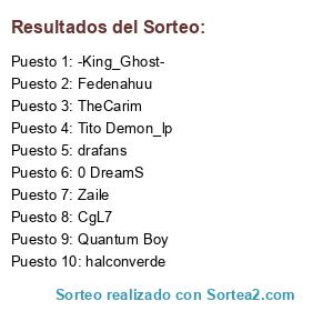 Lista de participantes: DarkScarlett, Yaya 14, Aldurin, ZOKSER, Fedenahuu, secuoyakiller, Pidatu, perkisitore, Chemamoide, The-Luckytime, Ira_De_Kor, Tito Demon_lp, Zaile, -A-radique-, archeroo, Bassa y Noe, DI-Jarkress, halconverde, Quantum Boy, Chow Yun-Fat, xeskomen, drafans, Ivo Cr, Godfrit, Enroca, CgL7, blakero2000, Nova02, -Silver_Wolf-, (-Bebeto-)Mx, GhostGlowLigt, manigoldo1, juanbaldo, 0 Degel, misterjm9, INDALICO, sergiosaurio, Joel B-CR, Peibolet, Mcsetorro, -DOBLAS-, TheCarim, rawreckless, Rey del Kamui, LordBelial666, -King_Ghost-, MM-Akashi, __shaktale__, ryd3n, 0 ASHURA 13, 0 DreamS, Zerzan, Resaca83, _ykmasda_, Rafa-pecke.