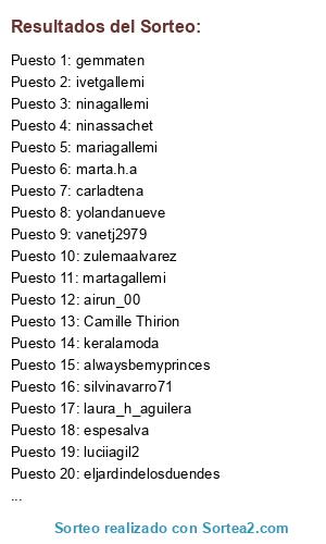 Lista de participantes: carladtena(6 participaciones), keralamoda, plum_madrid, sunnyentreprimas, zulemaalvarez, lbernalg78, elsuenodeteresa, mdiacol, monpetitcosmos(2 participaciones), esthertalenssanchez(2 participaciones), anademiguelk, adri_rosan, yolandanueve, espesalva(4 participaciones), petite_mais_grande, mimosparamama, vanetj2979(17 participaciones), 3sistersalamoda(2 participaciones), laura_h_aguilera, marta.h.a, airun_00(5 participaciones), alwaysbemyprinces, arhelu, luciiagil2(2 participaciones), eljardindelosduendes, gemam2, merrysanzg, Mayte Campos Ruiz, sonia_ivanov, zarith_kawaii, Maria Ro(2 participaciones), Mary Fernandez Gonzalez, martagallemi(12 participaciones), ivetgallemi(49 participaciones), mariagallemi(21 participaciones), martacaste, candyliving, emiballbe(2 participaciones), ninassachet(5 participaciones), ninagallemi(16 participaciones), angelavaquero, silvinavarro71, Camille Thirion, MaríaJosé Borrego, gemmaten(3 participaciones), annasula_, cullerotfestuc, claravancellsescude, vilatore(2 participaciones), mariamaserrat.