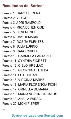 Lista de participantes: ORNELLA DEMARIA, VERONICA PATRICIA CAMPAGNOLI, DANY LLERENA, MARIA VERONICA CALOS, MURIEL GAONA, ADRI RAMPOLDI, GABRIELA CANTARELLI, ANALIA FARACI, VIRGINIA MARHE, SILVI MENDEZ, MICA ECHENIQUE, JULIA LUPINO (2 participaciones), SIL MAESTRO, VIR COL (2 participaciones), CYNTHIA FIORETTI, CIELO HRELLAC, MARIA FLORENCIA FICINI, MACA CHOCAN, BELEN LUPINO, LU CHOCAN (2 participaciones), ROSITA FUENTES, DAY DEMARIA, MONI PIEPER, CARO CHIPLE, GEORGINA TEJEDA.