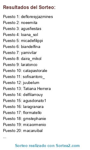 Lista de participantes: Cata Pastorale, Celes Davis, Serena Gil Bicella, Lucía Alonso, Melina Bernat Vazquez, Flor Matello, Juliana Giacone(2 participaciones), Monica Silva, Tatiana Herrera, Sofia Santoro, Ale Sastre, Karen Belen, Lauri Cevasco, Julii Molinas, Florencia Jazmín, Delfi Larrou, Yuri Alvarado Yamanoja (2 participaciones), Agostina Romito, ornellagriffa(2 participaciones), defloresyjazmines (6 participaciones), yamivilar(2 participaciones), delfirrouy, valeriafretes, naylabardelli, rocio.picallo(2 participaciones), biandelfina(2 participaciones), mileemacias (2 participaciones), noeemita (3 participaciones), agusfiestas (15 participaciones), gmstephanie(5 participaciones), dairodeiro(2 participaciones), elimontagna_(2 participaciones), lu.palacioss(2 participaciones), milipapuccio, _florbeltramo, catapastorale, jenniferkaren_, rociiogimenez, garinagus_, ayluubritos, clari.rg, nanuboigues, juubelum, belu_depilla (2 participaciones), agusdonato1(2 participaciones), mily_cortese, lulita_alonso, ivanaudrizar, julyiacovino(2 participaciones), cccarluux, solperezsarubbio, valentinadelsflugel, the_martta, evelynsool., aldilazcano, ailinguarnieri, ameliegoubar, pili_decastro, seresantos(6 participaciones), mikaelalus, micaelacirone, evelynsool, loanamia, claucentrone, liscammila, laragranara(2 participaciones), flormatello, merlimanzon, moremateos7(2 participaciones), marugiordan, melisimao, marticorenaval, macaruibal, anto.carrera, sofisantoro_, loana_sol, mariabelenponce, micaormenio, maarasol, aazulrodriguez, milelappano, josefinapiacentino, luliarriazu(2 participaciones), yayiidemunro, micadefilippi, breen.maldonado, lourmorenoo, paualvarezsanchez, erikaacolarusso, muuuffa, delfigomezg, moriigonzalez, delfilarrouy, agustinaademarco(2 participaciones), carbone.camila, daira_mikol, evehorton_, laratonco, br.brenda, agostinaromito, abruurones(2 participaciones), nicolfernandezok, valen_lis, juliettridolfo, canalescarla.