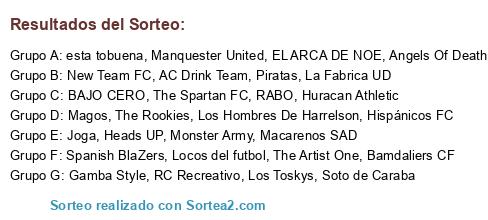 Lista de participantes: The Artist One, Piratas, Los Hombres De Harrelson, RC Recreativo, Bamdaliers CF, The Rookies, Macarenos SAD, AC Drink Team, BAJO CERO, RABO, Locos del futbol, Gamba Style, Hispánicos FC, Los Toskys, Angels Of Death, The Spartan FC, Heads UP, Spanish BlaZers, Magos, Soto de Caraba, esta tobuena, New Team FC, Huracan Athletic, Joga, Monster Army, Manquester United, EL ARCA DE NOE, La Fabrica UD.