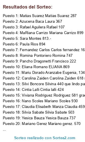 Lista de participantes: Abel Rodriguez nestor 150, Ada Mariela Rajal Ada rajal 239, Adela Ravenna Adela495, Adriana Antifora Adriana Antifora, 698, Adriana Antifora Adriana, 698, Adriana Castagna Adriana Castagna 182, Adriana Contreras contreras adriana 811, Adriana Diaz adriana 713, Adriana Escudero 311 adriana escudero, Adriana Gomez Adriana 600, Adriana Mariela Pais Adriana pais 215, Adriana Mineo Adriana mineo 948, Adriana Romina Alves 613, Agus Moraga de Santillan Agustina 353, Agush Tina Funes Agustína 702!!!, Aiirina Aviila Avila Natasha 135, Alan Naty Castillo Natalia 893, Alberto Ceferino Suhurt ALBERTO 257, Alberto Ledesma Alberto Ledesma 470., Alberto Ledesma Jorge Ledesma 123., Aldana Marinelli Aldana marinelli 460., Ale Baez Alejandra 675, Ale Etchegaray Ale Etchegaray dni 067, las quiero! !!!, Ale Garrido alejandra 835, Ale Silva alejandra 506, Alejandra Ale Roldan alejandra 214, Alejandra Arbide Alejandra 248, Alejandra Arce 630, Alejandra Asaf 506 compartido, Alejandra Asaf 506 participando!, Alejandra Asaf Alejandra Asaf 506, Alejandra Canales Alejandra canales 490, Alejandra Cinalli Alejandra 819, Alejandra Farise MUY BUENO Alejandra Farise 059, Alejandra Ibarra Alejandra 090, Alejandra Jaureguy Alejandra 048, Alejandra Karina Da Silva Quiero participar no conosc y me gustaria ir mi ult numer es998, Alejandra Nieto Alejandra 980, Alejandra Pellegrini alejandra 364, Alejandra Rios Allí estaremos en nuestras vacaciones!! Ale 895, Alejandra Villalba Alejandra 600, Alejandro Izzo 951, Alejandro Raul Luna Ale 476, Ali Acuña alicia 110, Ali Acuña lindo para pasar el dia a pleno en familia alicia 110, Alicia Fernandez ADRIAN BORRA 090, Alicia Fernandez GABRIELA BORRA 469, Alicia Isabel Minhot Alicia Isabel Minhot645, Alicia Riffa Alicia 389, Alicia Salgado Alicia Salgado 713, Alicia Sola Alicia 626, Alicia Yacot alicia 325, Alunahime-andy Los Cuatro Son MI Vida Laura 566 quiero ganar así comienzo el año genial en el mejor lugar que. Hay en mar del besos y muy buen año para todos.ojala tenga suerte., Alvarez Vivi Viviana Alvarez 567, Amalia Rosa Fuentes Amalia rosa fuentes111, Amis Mantilla Amalia 046, Ana Benitez ANY BENITEZ 711, Ana Burgos ANA 760, Ana Donoso Ana Donoso 264, Ana Marchetti Ana Julia 329, Ana Rubini Ana Rubini 223, Anabela Collera Anabela Collera 746, Anabella Cantero Anabella 187, Anahi Gonzalez Anahi 328, Anahi Palomino anahi 292, Analia Bautista 725. gracias¡¡¡, Analia Fabiana Alcaraz Analia 730, Analia Gaite 311, Analia Gaite Analia gaite 311, Analia Guerri 523, Analia Molina Analia 827., Anamaria Torres 408, Andre Guardia Andrea guardia 844, Andrea Algañaraz Andrea 026, Andrea Altamore Andrea 500, Andrea Anabel Demetrio Andrea Anabel Demetrio 182, Andrea Barrionuevo andrea barrionuevo 067, Andrea Codo Andrea 290(2 participaciones), Andrea D'Albano Andrea 658, Andrea Escobar Andrea 200, Andrea Fondovila DNI 691, Andrea G. Villanucci Andrea G. Villanucci 787, Andrea Garcia 397, Andrea Gonzalez 058, Andrea Gonzalez Andrea Gonzalez 058, Andrea Guillén 210(3 participaciones), Andrea Guillén 210 participando!!!!!, Andrea Guillén participando! Alejandra Asaf Roxana Gil Carolina Camargo Mari Martinez De Maricich Cerrudo Monica Maria Silvana Pallotta Susana Bausela Dany Petronzi Debora Martinez, Andrea Irigoyen Andrea 802, Andrea Mazzei Andrea mazzei 887, Andrea Miguens andrea miguens 085(2 participaciones), Andrea Ortega Andrea Ortega 144, Andrea Pacheco 267, Andrea Pacheco Andrea moreno 267, Andrea Paola Quintana andrea quintana 849, Andrea Pascual Andrea 688, Andrea Peña Maria Andrea 270, Andrea Veronica Suarez 731(2 participaciones), Andrea Villoldo andrea 410, Andrea Zambrano ANDREA ZAMBRANO 525, Andres Chamorro Andres Chamorro 014, Angeles Machado Angeles 816, Angi Peña Yoseli Parra 005, Antho Ruperstinsky Soria Erica Antonella 425, Any Fernandez any fernandez 325......, Any Fernandez BUENAS TARDES,,,ANA 325 SUERTEEE, Any Graziani anabel 911, Any Rios Analia Ríos 414, Araceli Martinez Araceli 377, Araceli Martinez Araceli, compartido 377, Ariana Aranda Ariana 750, Ariel Abalos Ariel 816, Ariel Arribillaga Ariel Arribillaga 341, Ariel Horacio Echevarria Ariel echevarría 908, Ariel López ariel López 364, Avon Vendo Todo Yo lo quiero conocer, pero como somos varios hermanos no nos llevan, seria la excusa perfecta! soy Benjamin Aguilar 380, Aye Diaz 263, Aye Diaz Ayelen 263, Ayelen Almandoz Ayelen almandoz 251, Ayelen Arancibia Ayelen 471, Azucena Baca Laura 367, Azul Palomo azul palomo 943, Barby Mostafa Barbara mostafa 802, Bel Favoretti belen 247, Belen Dorado Belen dorado 913, Belen Herrera Belen Herrera 309, Belen Mulieri 647, Belen Mulieri belen647, Belén Suarez Belén 184, Blanca Beatriz Rodriguez Blanca Beatriz 999, Blanca Salas Blanca salas 046(2 participaciones), Blanco Analia blanco analia 760, Bolsos Con Enfasis Monica 084 G R A C I A S, Bolsos Con Enfasis Monica peralta 084, Braian Ruiz Marcela Ponce Ivan 600, Braian Ruiz Marcela Ponce Marcela 959, Brenda Rosales Brenda Rosales 707., Brenda Teves brenda 859, Brenda Torasso Brenda Anael Torasso Mancuso 125, Bruno Garay bruno garay ....408, Cali Orellano Claudia Orellano 845, Cami Laa Mdq camila 330, Camila Acuña camila 686, Camila Chiaradia Camila 071, Camila Ginestel camila 957, Camila Martin Llull camila 185Ver traducción, Camila Westerlinck Camila 860, Camoga Papelera Yamina Luna 587, Candela Mellia Candela Mellia 131(2 participaciones), Carina Bringa carina bringa 613, Carina Fochi Carina 962(2 participaciones), Carina Luna carina luna 455., Carina Roldan Hola, Carina Roldan 579, Carla A. Mart Arist Carla Antonella Martinez, Ultimos numeros de DNI 012, Carla Barchiesi Mendez Carla 491, Carla Ekeroth Carla Ekeroth 441, Carla Rodriguez carla rodriguez 947, Carlos Damián Falchi carlos 082, Carlos Fabian Miranda Carlos f miranda 945, Carmen Rocchi 163 compartida!!!, Carolina Alfonsin Carolina alfonsin 184, Carolina Cabrera Carolina067, Carolina Evans Carolina Evans 460, Carolin