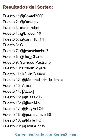 Lista de participantes: @Eliecerf19 , K3lvin Blanco , @mercerock , @jesuschacin13 , Anderson Benitez , @Chemi2000 , @EsyArTOP , @juanmalaver89 , @Kizz1206 , @AllanroyR , @Pedro668 , Ангел , @nadieexiste , @dani_10_14 , @Tio_Charlie , ꧁ঔৣ☬✞ᗪ乇丂ㄒ尺ㄖㄚ乇尺▄︻┻═┳一 , G , @alejoaceros , @Josemiguelguevara1980 , Silvio Ricarod , @MailethGH , @Omarlpz , @JJBAFinanzas , @premierprotv , Johan Márquez , Darwin Garcia , Naty Utrey , @EdinzonSL , @wolfblack9001 , @Carlos27b , @Mauriciopadron06 , Samueo Pastrano , arley ruedas , @SoyElNegrito , @jhon14b , RussellC2019 , Luis Rangel , @Jorvint_ollarves , @carlosluispinto , keidelis , @DelizbethCJO , @DeliaIRJ , @RosibelCBJ , @DeliayniFGR , Josefa Guzman de Aristiguieta , @yulitineo123 , Luisa , manuel parica , @Jeanaguilar3 , Adrian Ramírez , @EstafanoGarcia , @Marshall_de_la_Rosa , Brayan Myers , @MatiasExequeil , [AL3X] , Moises Monchi , @JosueP235 , mauri rabel , @Tokimoro07 , Gabo XD , @Fenix_CM , .