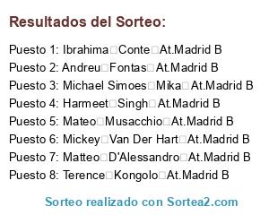 Lista de participantes: Mickey Van Der Hart At.Madrid B, Leonardo Bittencourt At.Madrid B, Sergio Canales At.Madrid B, Lucas Torro At.Madrid B, Pablo Sarabia At.Madrid B, Mateo Musacchio At.Madrid B, Terence Kongolo At.Madrid B, Dame N Doye At.Madrid B, Ignacio Camacho At.Madrid B, Michael Simoes Mika At.Madrid B, Lamine Gassama At.Madrid B, Leroy Fer At.Madrid B, Jonathan Dos Santos At.Madrid B, Harmeet Singh At.Madrid B, Matteo D'Alessandro At.Madrid B, Jozy Altidore At.Madrid B, Ibrahima Conte At.Madrid B, Andreu Fontas At.Madrid B.