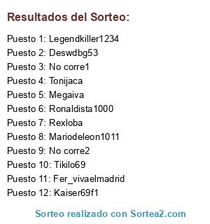 Lista de participantes: Megaiva, Fer_vivaelmadrid, Ronaldista1000, Legendkiller1234, Rexloba, Tikilo69, Kaiser69f1, Mariodeleon1011, Tonijaca, Deswdbg53, No corre1, No corre2.