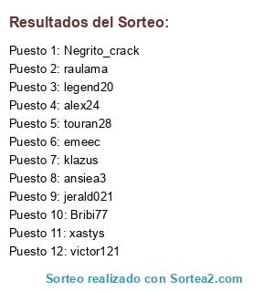 Lista de participantes: Bribi77, xastys, alex24, raulama, legend20, jerald021, klazus, emeec, Negrito_crack, ansiea3, touran28, victor121.