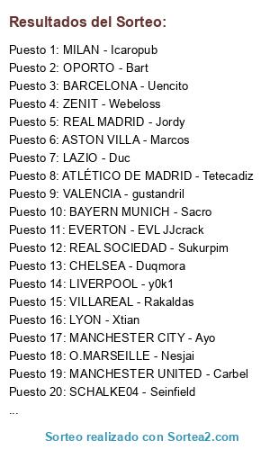 Lista de participantes: BARCELONA - Uencito, REAL MADRID - Jordy, EVERTON - EVL JJcrack, MANCHESTER CITY - Ayo, VILLAREAL - Rakaldas, REAL SOCIEDAD - Sukurpim, INTER - Ace, ATLÉTICO DE MADRID - Tetecadiz, MILAN - Icaropub, ZENIT - Webeloss, BAYERN MUNICH - Sacro, TOTTENHAM - Carkill, ROMA - Skelet, JUVENTUS - Droigner, LYON - Xtian, SEVILLA - KloN, VALENCIA - gustandril, CHELSEA - Duqmora, HERCULES - Primito, ALMERIA - Calmpepe, OPORTO - Bart, LIVERPOOL - y0k1, O.MARSEILLE - Nesjai, WOLFSBURGO - Celorios, LAZIO - Duc, MANCHESTER UNITED - Carbel, ASTON VILLA - Marcos, ARSENAL - Carlossocio, B.LEVERKUSEN - Gabito, GETAFE - Doc Amor, SCHALKE04 - Seinfield, WERDER BREMEN - Aketesnuko.