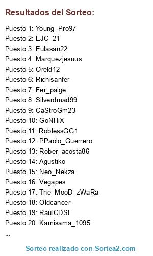Lista de participantes: Barboza12_, Balagol, Into-__-86, Lolito_22, StipePavin, GodofthenorthSS, F4r40n1988, Mikiteifa10, Agustainer, KaiSER-SH7, Richisanfer, Labestianegra10, Cheche19, Hectoryenzo, Rober_acosta86, ALE87_ITA, Joanfcb, ReDerHugo, PaUUU24, TommenOrtiz, LazaTheGreek, Cases_89, Mallorcakiller9, ADumat_6, Rafuka_7910, Petros_1610, JoseTheCatalyst, Abrahamm0726, Valle__17, KaseO_crew_, Dhayann7, Mokispucela, Superdinho, Momojuve_Pes-YT, Guille_Im, gutista-14-, Tachin_6, PEP_TEAM1988, Young_Pro97, Kamisama_1095, Sam---, Pablocusan, Pastrakas, Gerpi, Kampfer555, Miguel_Ruano, Marlito12, erkobra18, Bomco89YT, Davosss_, Fer_paige, Joselito3489, INDOMINATOR, DAMI_ALMENARA, Mateocamisa10, Komario14, KRIS_DAM_DAMELLI, GYRL_TFC, Jesure9, Adrianmaese, Yekaaluish, Zeusinjo, Danielito_87, PPaolo_Guerrero, ilMerci, Kamiikaze26, Bekobic, Ekoh, Moixulillo, aco_shuby, PiLuXi90_-twitch, Coner, LPS_YellowGirl, Bubo79, Markkissio, Anquiher, LPS_Diffside_45, Daniosasuna1, Moiises92, Tililis, Juan_angel10, JC_STUNNER_90, RoblessGG1, B10_joker, Cortex_xx, Mcmeher, CRIMINAL7GAMER7, LimbergAVM, MEHMAN, SharkGar06, Diepzalig11, Angel307, Teclis-88, Sem___1907, Agustiko, Rhinopantera, JSoares6_, Eulasan22, Rafinter934, Xnomad89, Rafana, marcosmnc, Farbax, Ayo_ESP, Clapped_by_mv, Raul--7---, Cariddean_69, Trammel7, W84IT-14, Malasombra21, JONY-CAPIYOU123, Stejinn7, Amortee, Pirujin23, Dominho3, PhaNtOm_Duck-95, MAKSON_AAA, AndreBBV94, Chev_CheLLioS, JUANCARLOSRIVA, Danielitoperu10, IMPERADOR, Nyzanes, Elcheri81, Yiou13, Vegapes, Soto___11, AlonsoGrayFox, Super_john_09, Henkdenhaag, Veldruuk, Elvisionario869, Diegoforlan997, Adry_an12, Josecr23, Troyanitooo999, SASINHO-DIGIAC, Oreld12, Francisflores, Abforz, CaStroGm23, Vross77, Ssg_salvador, Tomlas77, Tetebelda, Bruninhuh66, Roque_luis, Imbaedo1, Alenzema, The_MooD_zWaRa, Jock_86, RaulCDSF, Ivan_madrid23, No1Pirate, SergiAbramo, Buba_bsj, -Javitri, Danii_sniper8, Fer_Don3p, Larrazabal_22, Younigaviria, Kulecroatia, Caubo12, Victorjg11, EJC_21, Peperecre1987, LUCIS84, missolafa, G66physis666, Super__ILO_, Veluu18, M1n3r0, Jorgelm7, Boki_todor, GIIANSS, Mistycbox, Kvothe_the_hero, Huied, Dorian_Fear, antonioperezSFC, Plantifulbat7, Rebollo777, Enrimabe0, Oldcancer-, Herreros_88, FV_Dementor, arcinius1898, Lakylu, Fabrizioahah, Thespartan30708, Satrustegui_69, Elayuwoki11, Manquito-1610, Delpi_10_, Kefergas, Micaelzinho92, Carly777, gamadrid, Fabio__85, Reymago11, Soccatala73, FETIH1453elTurco, Milan17Jon, Sr_Osquitar, Perezleyua_93, Sheriffchenko, Adekles, Asg86zzz, Sr_lujuria, Jpf-2009, OGK_sirAlmeida, Happyordonez, Pablochivote-pes, Angelete_7, Domy1000, Killote21, Jownd, el_PeLuSa_86, Juanmi_cordoba, Catarinotkg, agresivo100, Daark_simo, Baena_betis, Ericko01i, GoNHiX, Twisterswar, Ju20no, Cadista_amuerte, Silverdmad99, marcoslg4595, Garcia_13013, Alejandrogzlps, Fabiosousa_1992, Angeltotote, el_mansino, Emirunal_39, A., MONROYO23-, Javilota_14, Migue_86, Antoniale5, Piponayara, Luis__pa, Marquezjesuus, Juanvi_pto, AURE83UANM, Maritodoki, Lekter_10, BuoesteeTUUUU, Gravesen16, ShayBouznah8, Aepv90, Neo_Nekza, Jorginho5_5, VICDLNO37, tittogami.