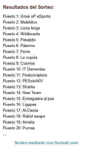 Lista de participantes: Entregados al pes, Wildboards, Halcones, Pesejido, Fenix, Rabid wasps, Malakitos, Foxes, Sharks, La cupula, Ligapes, Qlash New Era, Pesclassics, Criminalpes, Pestival killers, Amelia, Gorilas del Pes, Pumas, PES&LOVE, Padawan, At.Ceuta, Palermo, PES-Selection, Apaches FC, IT Dementes, Grow uP eSports, PESoloNOI, Peslociraptors, Cosmos, New Team, Spartans eSports, Lions kings.