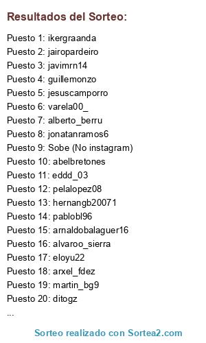 Lista de participantes: pelalopez08, alberto_berru, guillemonzo, davidalvareezz, icecar84, ikergraanda, pelayocoto_, varela00_, abelbretones, zafirofr, javimrn14, jesuscamporro, alexiis_4, pablobl96, ditogz, gabrielinsuaalvarez98, eloyu22, michu02_21, martin_bg9, alvaroo_sierra, oscar.riveragarcia.9, chrissantos14, arnaldobalaguer16, jonatanramos6, jairopardeiro, fernandorf98, arxel_fdez, eddd_03, hernangb20071, _ivanvs, fraanchu91, Sobe (No instagram).