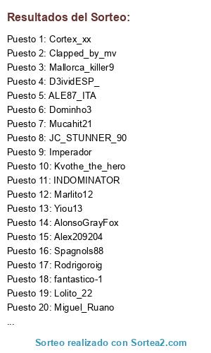Lista de participantes: D3ividESP_, Cortex_xx, Kvothe_the_hero, gutista-14-, Isra_almansa, ALE87_ITA, Dominho3, Yiou13, Miguel_Ruano, Alex209204, Cheche19, Marlito12, Young_pro97, AlonsoGrayFox, Vegapes, Barlica_churros, Mucahit21, Mallorca_killer9, JC_STUNNER_90, fantastico-1, Lolito_22, gamadrid, Jock_86, Rodrigoroig, INDOMINATOR, Spagnols88, Clapped_by_mv, ekoh, Imperador, JUANCARLOSRIVA, Erkobra18 / GodofthenorthSS, EJC_21.