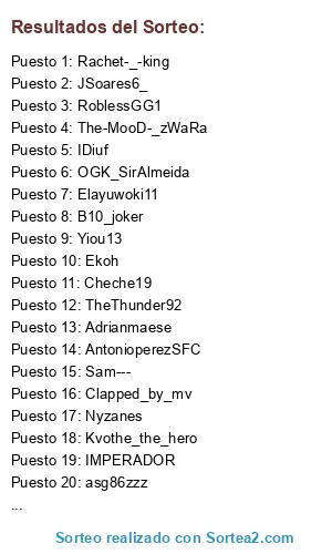 Lista de participantes: jorcha_5, Stejinn7, erkobra18, Zeusinjo, isra_almansa, ADuMat_6, Dorian_Fear, Kampfer555, Plantifulbat7, AntonioperezSFC, LorisGame77o, Ferran8r, IraHooliganZ, Cases_89, Lucls84, Jorgelm7, SharkGar06, Rachet-_-king, GYRL_TFC, RoblessGG1, Alex5000_kruji, CaStRoGm23, PixMax_GRD, Sam---, Mokispucela, Teclis-88, JSoares6_, Superdinho, Sem___1907, DAMI_ALMENARA, Moiises92, Cheche19, Cortex_xx, Kvothe_the_hero, Elayuwoki11, Boki_todor, Danielitoperu10, Kamisama_1095, Young_Pro97, Farbax, TiLiLiS, gutista-14-, MEHMAN_, Labestianegra10, AndreBBV94, Rodrigoroig, Abrahamm0726, Caubo12, Ekoh, LazaTheGreek, B10_joker, Miguel_Ruano, YellowGirl_17, Arcinius1989, Rober_acosta86, PEP_TEAM1989, JC_STUNNER_90, Raf_934, Pirujin23, Henkdenhaag, Diepzalig11, Imbaedo1, Genoa_NPK02, Mallorca_killer9, DesertGalacticos, Joselito3489, -JAVITRI, Nyzanes, Super__ILO, Malasombra21, The-MooD-_zWaRa, No1Pirate, OGK_SirAlmeida, Adry_an12, Fabio__85, Larrazabal_22, KRIS_DAM_DAMELLI, Marlito12, Cariddean_69, Clapped_by_mv, Komario14, Lolito22, Barlica_churros, GIIANSS, mcmeher, GodofthenorthSS, Adrianmaese, Neo_Nekza, StipePavin, Sr_Lujuria, F4r40n1988, Mistycbox, Yiou13, Captain_SSFM, SergiAbramo, JONY-CAPIYOU, TheThunder92, IMPERADOR, Menteenferma_10, MaarquezJ, Mikiteifa10, Pablocusan, Soto___11, Fer_Paige, Sussi1313, Herreros_88, Troyanitooo999, Fer_Don3p, diegoforlan997, danielito_87, Lps_bruninhu66, Crthn93, G66physis666, Dominho3, abforz, Generalpestbest, JUANCARLOSRIVA, Davosss_, bomco89YT, Anquiher, Kulecroatia, Daniosasuna1, asg86zzz, IDiuf, Sheriffcchenko, Peperecre1987, Sr_osquitar, thespartan30708.