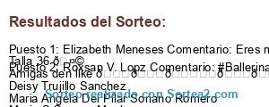 - Ganador 1: Elizabeth Meneses Comentario: Eres mi ejemplo a seguir , tus enseñansas y tu amor me hicieron ser la persona que tu querias que fuera .Gracias por todo madrecita querida 😍 Talla 36 🤩 Amigas den like 👉👈😎☀️👑💐💙 Deisy Trujillo Sanchez Maria Angela Del Pilar Soriano Romero Maria S Carrera Machuca