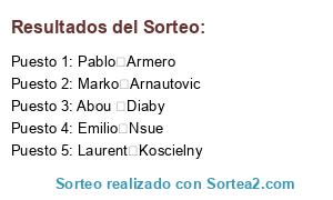 Lista de participantes: Nombre Apellidos, Diego Lopez, Artur Moraes, Arda Turan, Xherdan Shaqiri, Ander Herrera, Stephan El Shaarawy, Philippe Coutinho, Abou Diaby, Pablo Armero, Marcelo, Wellington Nem, Miroslav Stoch, Marko Arnautovic, Emilio Nsue, Laurent Koscielny, Bruno Ecuele Manga, Sergio Agüero, Leroy Fer, Toby Alderweireld.