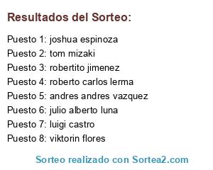 Lista de participantes: robertito jimenez, luigi castro, andres andres vazquez, roberto carlos lerma, tom mizaki, joshua espinoza, julio alberto luna, viktorin flores.