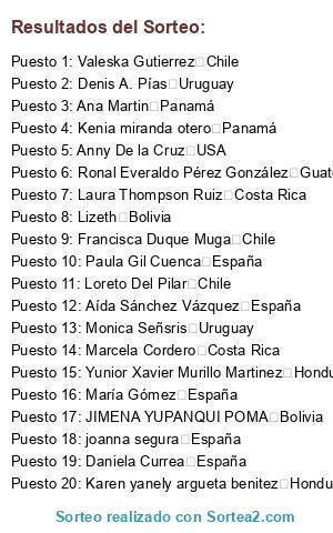Lista de participantes: Eladia Gesto De Jesus Republica Dominicana , Monica Señsris Uruguay , Denis A. Pías Uruguay , Anny De la Cruz USA , Fabio í“scar Molina Venezuela , Kenia miranda otero Panamá , Ana Martin Panamá , Aída Sánchez Vázquez España , Daniela Currea España , Alejandro Ochoa Pareja España , joanna segura España , María Gómez España , Paula Gil Cuenca España , Ronal Everaldo Pérez González Guatemala , Yunior Xavier Murillo Martinez Honduras , Karen yanely argueta benitez Honduras , Laura Thompson Ruiz Costa Rica , Marcela Cordero Costa Rica , Lizeth Bolivia , JIMENA YUPANQUI POMA Bolivia , Valeska Gutierrez Chile , Francisca Duque Muga Chile , Gerardo Durán Pino Chile , Loreto Del Pilar Chile.