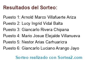 Lista de participantes: Arnold Marco Villafuerte Ariza, Velásquez Retamozo Paul Eduard, Rios Eunofre Diego Armando, Contreras Palpa Elisabeth Joan, Lucy Ingrid Vidal Balta, Renzo Alfredo Velapatiño Salvatierra, Julio César Quispe Toralva, Nestor Arias Carhuaricra, Verónica Andrea Tamariz Valentín, Gerson Santiago Bernabe Velasquez, Giancarlo Luciano Arango Jayo, William Alexander Córdova De la cruz, Geancarlos Tomas Aparco Alarcon, Diana Marisol Sanchez Rodriguez, Ana Rosa Oblitas La Rosa, Johany Cuenca Acuña, Mario Josue Elejalde Villanueva, Giancarlo Rivera Chipana.