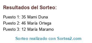 Lista de participantes: 1 Manuel Pimentel, 2 María Bracero, 3 Ainara Alzona, 4 Beatriz Crem, 5 Merche Pérez, 6 Montse Fdez, 7 Moni Torres, 8 Imma Cervera, 9 Vanesa Guerrero, 10 Gloria Bes, 11 Ana Navarro, 12 María Maramo, 13 Teresa García, 14 jessica Feito, 15 Farhet Husson, 16 Marta Montero, 17 Miryam Adsuart, 18 Alicia Laguet., 19 Sandra Ferré, 20 Carmen Roldán, 21 Desiree Ramirez, 22 Buscador de Sorteos, 23 María Marcos, 24 Mónica Cestón, 25 Carolina Velázquez , 26 Juan Laviraz, 27 Mara Vaño, 28 Vanesa Muñiz, 29Yessica del Amor, 30 Jennifer Domínguez , 31 Concepción Matías, 32 Almu IA, 33 Ana M Ramos, 34 Eme Arguiz, 35 Mami Duna, 36 Nuria Bueno, 37 Dayana Barreto, 38 Pańaleando Tartas, 39 Virginia Acebedo, 40 Noemi Prieto, 41 Luisa Fluixa, 42Veronica Gómez, 43 Neli Quinteirio, 44 M Carmen Rodríguez , 45 Dayana Barreto, 46 María Ortega, 47 Tenta RM, 48 Antonio E Cuerdo, 49 Amparo Samchez, 50 Nieves Moreno, 51 Lidia Sánchez, 52 Esteban Díaz , 53 Diana Monteiro, 54 Eva Moreno, 55 Eva García, 56 Merchi Quinteiro, 57 Ana Varelo, 58 Chris Hana, 59 Mónica Herreiras , 60 Rosa Moreno, 61 Liz Medina, 62 Ruth San Juan, 63 Ángela Carpente , 64 Lore Sáenz, 65 May López, 66 Patry Frág, 67 Celia Pérez, 68 Sil Vía, 69 Issi Trunser, 70 Elisabeth Palomares.