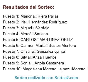 Lista de participantes: Elena María Martínez Rodríguez, Juan Carlos Giraldo González, Olga Castillo Macia, Fabiola Segura Hernández, Arancha Roncero Corredera, Erica De la Torre, Dolores Fernández Cabello, victor Aparicio, Marta Montaña Álvarez, Julia Cano Sanchez, Sandra López gris, Cintia Cedro Lopes Teles, María González Martín González Martín, Maty Armenteros, Pilar Cabre Rubio, Ruth Vázquez López, Vanessa Cañadas, Pilar Rubio Embid, Mirella Villar Ruiz, Tatiana Faedo Gukasian, Marta Diaz, Margarita Victoria Sánchez, Clara Gutiérrez González, cristina Canals Sánchez, Clara Cremades Calabuig, soledad rodriguez lopez rodriguez lopez, Isabel Maria Soriano Pérez, Tatiana Yesenia Arias ventura, Vanesa Onrubia heras, Ángela Salgueiro Piñeiro, Teresa Palomo Martinez, julio Esteban, Maria José Torres Solleiro, Silvia Serrano, Idelina Martinez Ruiz, Isabel Garrido Terol, Inmaculada Domingo Cívico, Mónica Cabral Cabral, Amparo Valls clofent, Nazareth García Benítez, Sandra Villaverde, Beatriz Crespo Pérez, Sonia Rodríguez García, Estefania Moya serrat, Victorita Grigoras, Lourdes Dinares Marcos, Mari Carmen Alcaraz Garcia, Maria Gil Balanza, Noelia María García García, Nuria Macías García, Magdalena Cachafeiro Corchuelo, Almudena Castro, José Luis Díaz García, Ariadna Montes Fernández, Ana GIL ALBARELLOS, Mónica García González, ESTHER CORCHETE FIGUERAS, Carmen Rosario Luque Posada, Lucia Diaz yalbacete, Maria Elena Oliver Perpiñá, Maria Munin Neira, JULIA FIGUERAS COMAS, Diana Mozo de la Fuente, Ginés Piñero, Kristina Bezpaliuk Bezpaliuk, Luis Bartolomé Bartolomé, Cardamas Freire Cardamas Freire, María Adela Latorre Grau, Irati Cha, Paquita Méndez López, Dolores Maldonado Amaya Maldonado Amaya, Ana belen Rodríguez Sánchez, ISABEL Gil Ortega, Silvia Blanco Poncela, Vanessa Álvarez Caballero, Sonia Artola Castanera, Natalia Ramos, MARIA JOSE JUAN MARCO, Isabel Briales Plaza, Raúl Naranjo Aragón, África Sáez Chamizo, Belen Fdz de retana, Luisa María Garcia Repiso, Esther Pomar piña, Eulàlia Rodríguez Claramunt, Montserrat Patricia Ceballos Gómez, Raquel Cano Soler, Jose Javier Nieto onsurbe, Dolores soler Rodríguez, Elena Mahedero, Miguel Veguer Tendero, Joaquina Tendero Romero, Sonia Gonzalez Fernandez, Silvia Fernandez, Elena Fernandez, Luz divina Vega Luján, Pepa Ferré serrat, Ana María De Fuentes Leco, Carmen Selegante, Maria Costa Fernández, Aitana García Gomis, Matilde Llorca Pérez, PURA SANZ, Ana Cucó Sanz, Sandra Maderal Castro, Pilar Bravo Bravo, Silvia Bartolomé Bartolomé, Teresa García Díaz García Díaz, Teresa García Díaz García Díaz, Alberto Castresana Pérez, Pablo Sixto Cortés, Maria Manna, Amparo Juliana Pajuelo Castro, María José Sanz Nuez, Asier Aguirre Merino, Yolanda Villoria Martín, Veronica Serna, Agustina Hernández García, Miguel Verdejo Verdejo, Miguel Angel Rodríguez dueñas, Mercedes Gonzalez Lima, Belén López, María Antonia Rey De Pablos Antonia Rey De Pablos, María Amparo Martinez Moya, Paula Irizarri Saborido, María del carmen inmaculada Espeso jimenez, Zulema Pontes Vidal, Desiree Asensio Serrano, Rebeca Asensio Serrano, Isabel Maria Serrano Valle, Gonzalo Asensio Sanchez, Davinia Sa, Ana María Gutiérrez González, Antonia López Cecilia, Ruben Herráez Navas, Eva Sanchez, Lola Ramírez Serrano Ramírez Serrano, Aurora Antón Escudero, María Teresa Fernández, Javier Montes González, María Jesús Labrador Vicente, Tamara Cayuela Navarro, Alejandra Medina brito, Esther Munguia Coca, Juan Manuel Rodriguez, Hanan Aiachi, Silvia Pizarro Domínguez, Eduardo Pelayo Gonzalez, Garrido Martínez Garrido Martínez, Francisco José Unibaso Santirso, Andrés Gutiérrez Cadenas, María José Urbina Lavin, Mercedes Fernandez Escudero, Patricia Ortiz Ortiz, patricia Montero Alende Montero Alende, Milena Lunedì, Antonia Valenzuela, Dolors Senserrich Pairó, Leyre Rampérez Quintero, Mara Ibáñez Duran, Manuela Sánchez Giner Sánchez Giner, Silvia Arco Abad, Marta Reyes gordon, Maite Sevilla del Pozo, Natalia Mas Navarro, Maria jose Salvador zapater Salvador zapater, Isabel Castello Martínez, Montse Valencia Perez, Montse Valencia Perez, María del Mar Ruiz Martínez, Laia Batllevell, MLuisa Flores, Natalia Mas navarro, Ingrid Peregrina Solá, Sergio Arnaiz Delgado, Manuel Rodriguez Abad, Josep Antoni Núñez Comuñas, Raquel Chacón, Angelines Sánchez Aguado Sánchez Aguado, James Breeze, Miguel González Roldán, Maria Jose Gomez de la Iglesia Iriarte, María Dolores Soriano Torres, Mónica Muñoz Álvarez, Olga Cabral Selegante, Gema Chacon, Maria Luisa Moya Ferrer, Zaida Ferrando De Diego, Ana Arnau, María Vidal García, Marian De la Cruz, Alejandra Victoria, Nuria Querol Moya, Saturnina Ferrer Yuste, Beatriz Nieto reina, Elena martinez torres, Stella Maris Arotcarena, Estefania Cadiz Cadiz, Sánchez Sánchez, Miriam lecina Enciso, cristina Cuenca, Noemi Escaño, Ana maria Galas Galas, Raquel Merida muñoz, Cecilia Diz Ucha, Empar QuilesVillen., Isabel Vera Luque, Laura Martínez, Silvia Cerezo García, Maria Navarro de la torre, Virginia Jiménez Carrillo, Silvia Mera García, Carmrn Arraez peinado, Marina Segovia Navarro, Jessica Dahour, María Monserrate Castillo Gas, Silvia Serrano Serrano, Elena Deleyto La Cruz, Alicia Cortadellas, Elena Navalon navarro Navalon navarro, Begoña Miguéns Miguéns, Laura Quintela souto Quintela souto, Maria Veloso, Susana De la fuente, Esther Almagro Gómez, Maribel Martínez-Abarca, Rocío Gutiérrez Cobos, Juani Rubio Martínez, Amparo Benítez Toro, Aina Simarro, Nerea Pina Galdón, Nuria Lacal, María dolores Muñoz Jiménez, Maria Treserras, Danai Delipetrou, Naiara Urtiaga Amorena, Rocío Veira Cedeira, Ana Valls Valls, Isabel Puch Valle, MARÍA TERESA MARTÍN FARJAS, Isabel Puch Valle, Isabel Puch Valle, Maria Mora Garcia Mora Garcia, Marta Homs Latorre, Elena Palomo Fuentes, Ana Garrido Gonzalo Garrido Gonzalo, Lola Coello Núñez 