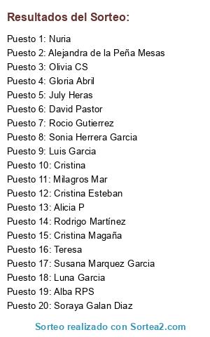 Lista de participantes: Sara Abad, Alejandra de la Peña Mesas, Lorena Alba Leon, Ivana Micheli, Raquel Escolar, Carmen Portela Gonzalez, Begoña Dubon, Silvia Menendez, S. N. S., Rosa Perez Alvarez-Cedron, Beatriz Horta, Mari Carmen, Jen, Sofia, Gloria Abril, Felipe del Pino, Angeles Manza, María Agreda, Begoña Barriga, Rosa Colmenar, Esperanza Aparicio Blanco, Sonia Sanchez, Olga, Miguel Angel, Diego de la Rosa, Carmen Aguilera, Arantxa Blazquez Alonso, Rafael Lopez, Rebeca, Jesús Martín, Paloma, Beatriz Díez García, Ángela María Raya Miranda, María Teresa García Ortega, Alicia Kaya, JESUS HERRERA FLORES, Ignacio Herrera, Marisa Correyero Alcolea, Silvia U., Pilar C.R., Antonio Garcia Roa, David Pastor, Cristina Esteban, Rafael Cenjor Gutiez, Rosa Cedron, Esther, Victoria del pilar, Angel Montero, Soraya Galan Diaz, Maribel Guerra, Gustavo Tallón, Alicia P, Patricia Alonso Mendoza, Martin Garcia, Carmen Mendoza, Cesar San Felipe, Milagros Mar, Beatriz Frutos, Isabel Ruiz Borrego, Luis sánchez Vázquez, Natalia María, Yolanda Canellas, Raquel Martínez serna, Arantxa, Alba RPS, Rosell Llorente Ruiz, Ane Gabiria Lara, Montse Moyano, Alfonso del Pozo Manzano, Victoria OV, Consuelo, Paula, Sara Domínguez Macías, Isabel Soto Castro, Pilar Bravo Ibañez, Laura Vallejo, Juan Antonio Perez Perea, Esther Cuadrado, July Heras, Teresa, Emiliana Cabello, Paula Garrido Alique, Ana Primavera, Manuel Pascual, Olivia CS, Mª José Arias López, Guzmán Garrido, Maria Luisa Ramos, Javier Culpian, Sonia Fernandez Varga, David Andres, Susana Matute Peral, Nuria, isabel lopez astasio, Diego J Garcia Martinez, Pedro Martinez Lopez, Mª Ángeles Lozano Martínez, Cristina Garcia, Felix Mateos, Blanca Biedma, Luna Garcia, Lorena Serna Saiz, Rocio Gutierrez, Vanesa Ambrona Medrano, Sonia SC, Rodrigo Martínez, Soraya Rincón García, Azucena García Berceruelo, Jaime Miranda Cordova, Luis Garcia, Verónica Mora Sánchez, Pilar del Valle, Dam, Ana Isabel, Mercedes Rivas Avilés, Veronica de la hoz, Laura, Raquel Remigio Zapatero, Isabel Masián Guillén, Antonia, Tamiko, Mario Carreras Vellisca, Susana Marquez Garcia, Sonia Herrera Garcia, Ana, Sandra Vicente Peña, Gema Gonzalez Garcia, Ruth Fernández León, Carla Vargas, María Esther Wenceslá Gómez, Elena Carpintero, Antonio Ruiz, Agus, Alejandro Vazquez Aguado, Nuripuck, Laura Juarez, Ana Isabel Minaya Quiñones, Martin Valenzuela, Inma, Aitor Palomar, M Isabel Otero, Cristina, Berta Balaguer Vega, Toñi Cabrera, Miriam Pareja Mengual, Manuel, Miriam Verónica Glago, Susana Cagle, Cristina Magaña, Eva Mov, Angeles Pompa, Lara Moyano, Monica, Chema Recio.