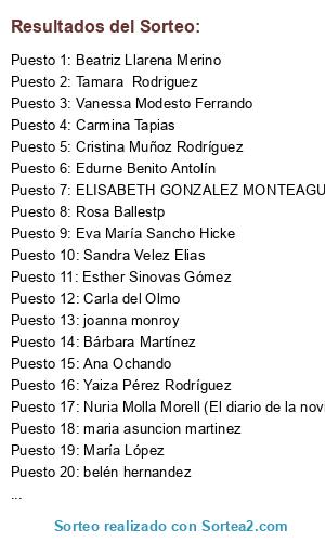 Lista de participantes: Ana Belén Torres, miriam moran fernandez, SaretaBe, Jessica Alvarez, Ilazki, Beatriz Negro López, Cristina de las Heras, Inma Ro, Elena Alvarez Garcia, MaríaLuisa FArgerich, Sandra Nancydemoniaca, luisa fluixa, Raquel Sperides, Doris Gómez Soler, Verónica Cardona, Las bodas de Marta (Marta Toldrá), Isabel Pereira Gonzalez, Lorena-Mis pequeños secretos, Patricia Sanchez, Elvira Navarra, Elena Pontón., Sonia V G, anita frambuesa, Pilar Villanueva, Macarena Quintano, Noelia Santacreu Navarro, Irene García Burguillo, Jesus Reyita, VIRGINIA PEÑA CRUZ, Arantxa Jabato, Ana Marti, clara posada Rodríguez, Anita Rodríguez González, Maria Garcia Garcia, Miryam Galiano Carrión, El diario de la novia 2013, Reichel9, Mª Ángeles Lagares Carretero, Leti Almagro, Lucia del Arco, laura mendez rodriguez, Jose Julian Escudero, Maria Jesus, Anaid Tururu, Mai Tesoro, Xandratelier, Guiller Tarara, Míriam Pareja Mengual, Tamara Robles, Angela Fullana Antich, Begoña Camblor Pandiella, Bárbara Cervigón, Neus Company Puigdellivol, Raquel Costa, Ana Ochando, Almudena Valdes, Ana Cristina Cappuccio, Izaskun Valduvieco, Isabel Vert, Sara Pousada, Diana Giselle Sanabria Forcado, Marygloss, Carmen Fernández Muñoz, vane segura face, ana belen garcia gonzalez, Batirtze Sáez, Anna Lajara Fernández, Patri Pascua, Elenusqui, Md Díaz Cruz, Déborah Tg, Carmen Meléndez, maria wasmer romero, Eva Ramos., Virginia Bermejo, Jessica Vaquero Cuervo, Ali Olalla Salmón, Maria Rosa, Irene Navajas, Ana Valls, Tamara Fernaud, Teresa Bonet Rosario, Dyablessa, LIDIA CASADEMONT, Eva Gd, Raquel Cabalga, Mónica Prieto, Amore Tocados, Anaís Sanz, chelo moa, Ángela Plaza, Iris Ayso de Casas, Rosario Muñoz Castro, Nuria Sanz, Idoia San Ildefonso Bilbao, Nerea González, Lorena Carreira Gómez, Teresa Tornero Rubio, clara Gutiérrez González, Julian Sanz Muñoz, Domingo Carrique, Elena Knyazhechenko, Ingrid Chico, Carmen Díaz Moreno, Cristina Gonzalez Cabeza, Mara Rabal, Isabel Ysuscositas., Elizabeth Mateo, Isabel Gragera, Maria Coronada Rosa, Maribel Rosa, Mari Carmen Rosa, Isabel Carmona Gázquez., Carolina Tierno Vega, mercedesreifsantiago, Laura Tortajada Ferris, Sonia Sanz, Alberto PC, Ariadna Torralvo, Ana Escudero Víctor, Noemi Castro Bullon, Jessica Garcia Villegas, Oscar Leal Díaz, hueleacoco.