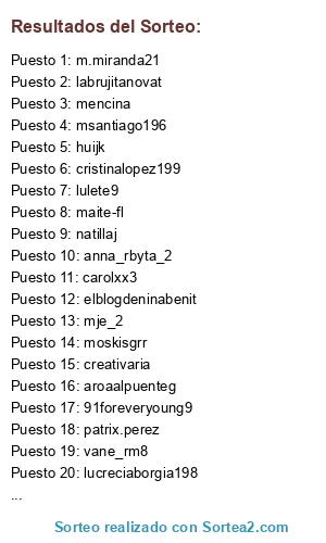 Lista de participantes: rozul, yolanda.torresbarquill, visilopezfelip, vi_lo_z, vircamen, virginiairagu, vane_rm8, vane_tgn, adaia, tcolino, susanapaulagilusano, sofia_fm, silbart, s.blanco7, csmas_sar, luna0azu, rutyte9, sharoa, romidiciembr, syntheticbutterfl, rhaquel3, raqta, raquelgonzalezar, bolitasworl, huijk, rafayy, mpmelendez1, pilar__281, prodriguez, rubertsmallorc, misstifor, patrix.perez, Olipope, nuriamg6, noemisha, xipreir, elblogdeninabenit, nerea54, nelapomedi, natividadsansierr, natillaj, nataliadazavel, txu, myri31, avistadem, montse.perez8, mabreu_96, mencina, monicamartinez3, miriamma2, Miriam.g.m.8, Miriam_calda, Myriami, labrujitanovat, mseijas, mayte24, canora7, freesoul_2, afroditam, martam_, twilighte, m.miranda21, mara4895, charmedinthebeac, rmorale, dunas3, lucreciaborgia198, pilica197, kery-2, mariajo8, mje_2, mjanemartine, Mariaher95, marub_sta, vilocha6, maryalv0, marjerez0, marmalab, misela197, marhya_m_o198, trufon3, marhta_m_o198, creativaria, carmenmartos4, eldiariodemaria, teresitacoo, mguced, marinmorenomargarit, mamen1976v, msevillad, maite-fl, msantiago196, luisagarcia6, elektrak_02_l, 91foreveryoung9, perlica8, leirelazar, eriel_moo, leireazket, lulete9, katiblag, kaml.b, huijks, spadic, jessikausano, isa_gr_1, asira_a, isabdlul, irenea198, macugonzalez_, mapachitoblogge, inesita-9, g_cuetar, gema8, francis_bdj, evachico, Evasilvestre, cukad, evaaa357, etv7, e.s.a3, aurorabri, mariajose3b, cristinavaleix, zeltia2, kristop, cris.fer, cristinalopez199, kelika.7, charoal3, alwaysso, ceciliacinjordi, carol.roge, carolxx3, carmen_rocio4, mamenjoaquin3, asturianina4, cargarm, candidolopez5, caminogarat, worldofbianc, bely_c, b.coc, beavaldescerez, beayflo, bpirace, miss.potingues.mai, starsy_lokit, b.quijan, leticia.eguilaz.lazcan, aroaalpuenteg, ramoza5, poxola_3, anahisuarezmartin1, anismar, ana_isabel_199, anitadiminut, Anamfercanga, anna_rbyta_2, solete78, abasuniversitari, alazne.penach, moskisgrr, aguedamat, agatha15b.