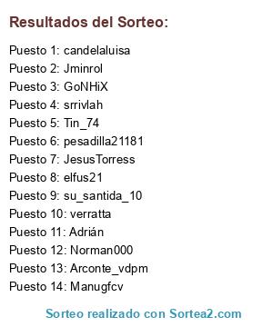 Lista de participantes: GoNHiX, Norman000, srrivlah, pesadilla21181, elfus21, su_santida_10, Tin_74, Jminrol, verratta, Arconte_vdpm, Manugfcv, JesusTorress, candelaluisa, Adrián.