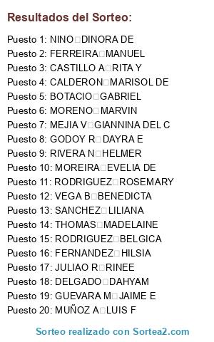 Lista de participantes: ALVAREZ ALEJANDRA, MACHADO ANGELICA DEL C. DE, BORDONES ARICELDA, CEDENO BARBARA DE, RODRIGUEZ BELGICA, VEGA B BENEDICTA, RUEDA BONILLA CARLOS, CHIARI CARMEN, MORALES CLOTILDE PINEDA DE, DELGADO DAHYAM, GODOY R DAYRA E, NINO DINORA DE, HERNANDEZ M DORALIS I, ABREGO R EDGAR O, CABALLERO ELSA R, MOREIRA EVELIA DE, AIZPRUA G EVELYN Y, MACHADO FELIX A, SANCHEZ V FERNANDO J, BOTACIO GABRIEL, MARTINEZ S GEROICY Y, MEJIA V GIANNINA DEL C, MARTINEZ R GLORIBETH Y, SANCHEZ GRISELDA, SANCHEZ GUSTAVO, RIVERA N HELMER, FERNANDEZ HILSIA, LUTTRELL ILEANA, TAPIA ITZEL M, MOFFATT JAIME A, GUEVARA M JAIME E, GUERRERO A JOSE A, MENDOZA JUAN C, REYNARDUS JUAN CARLOS, NG LO JUAN MIGUEL, SANCHEZ JULIAN, VIDAL JULIO C, MARTIZ DE VALDES KARLA, MARTINEZ KATHERINE, GONZALEZ KILMARA K TEJADA DE, DIAZ KIMAURA, ESTRADA LAURA I JARAMILLO DE, TULSIDAS LEISY, SANCHEZ LILIANA, ARDINES S LILIANA, ESPINOSA S LORENA A, MUÑOZ A LUIS F, THOMAS MADELAINE, LOPEZ F MADELENE, FERREIRA MANUEL, CALDERON MARISOL DE, OSPINO S MARISSA, MORENO MARVIN, GOMEZ G MAYKELA DEL C., MATA MELISSA PINTO DE, ESPINOSA MICHELL, JAEN MIRNA DE, MEJIA NELIS A, ZUNIGA B RAFAEL, MORENO REBECA DE, ARJONA A RENAN H, JULIAO R RINEE, CASTILLO A RITA Y, SANCHEZ RITO, REYES ROBERTO, RODRIGUEZ ROSEMARY, GUILLEN B TANIA E, DE LEON VIVECA M, JIMENEZ YAMICELLY Y, SALMON YAMILETH, GONZALEZ YANETH C, VALDES A YISEL V.