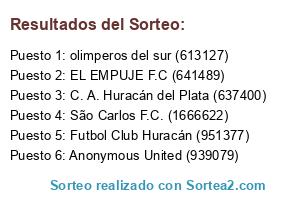 Lista de participantes: São Carlos F.C. (1666622), olimperos del sur (613127), EL EMPUJE F.C (641489), Anonymous United (939079), C. A. Huracán del Plata (637400) , Futbol Club Huracán (951377).