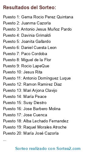 Lista de participantes: Joanita Gallardo, Davinia Grimaldi, Sonia Bm, Ramon Ramirez Diaz, Daniel Cuesta Leon, María Peace, Sonia Barbero, Jose Barbero Molina, Gema Rocio Perez Quintana, Susy Diestro, Miguel de la Flor, Jesus Rita, Antonio Domínguez Luque, Mari Arjona Clavijo, Antonio Jesus Muñoz Pardo, Alba Lechado Fernandez, María José Cazorla, Raquel Morales Atroche, Belén Navarro Narváez, Juanma Cazorla, Paco Cordoba, Jose Cuenca, Rocio LapeQue.