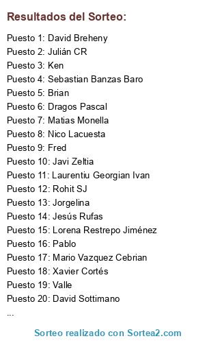 Lista de participantes: Adrian, Adrian Fernandez Salas(2 participaciones), Agustín Ramos, Alberto, Alberto Arruego Zabalza, alberto luján portas(2 participaciones), Alex Espanol Fandos(2 participaciones), Andrew Ostrenko(4 participaciones), Andy Diaz(4 participaciones), Angel Saavedra, Antonio Manchado, Aska(2 participaciones), Ben Frederik, Benny, Brian(2 participaciones), Carlos(2 participaciones), Cédric(4 participaciones), Christian Padilla(7 participaciones), Christopher O'Loughlin, Costel Ivan(2 participaciones), Dario Pereira(5 participaciones), Darllan Pinto(2 participaciones), David Breheny(6 participaciones), David Sottimano(4 participaciones), Dragos Pascal(3 participaciones), Ekin Selçuk, Esteban Martínez(2 participaciones), Ezequiel, Fabricio Peres Beletini(4 participaciones), Fernando D. Palacios(5 participaciones), Francisco Moreno(2 participaciones), Fred(4 participaciones), Harold Verbel Ramirez, Harry(2 participaciones), Héctor(4 participaciones), Ibon, Ignacio SM, Ihab, Jack Strat, Jas, Javi Zeltia(6 participaciones), Javier, Jesús Miguel Sánchez Casaús(2 participaciones), Jesús Rufas(3 participaciones), Jordi Casellas Estrada(4 participaciones), Jorgelina(3 participaciones), Josep Soldevila(3 participaciones), Juan Carlos Yto, Julián CR, Ken(6 participaciones), Laurentiu Georgian Ivan(3 participaciones), Lea Jaramago, Lorena Restrepo Jiménez, Luis, Mario Vazquez Cebrian, Matias Monella(2 participaciones), Matt Webber(3 participaciones), Max Hewitt, Mokhless(2 participaciones), Morten Nielsen, Nico Lacuesta(6 participaciones), Omar, Pablo(3 participaciones), Poure Al, Quentin(2 participaciones), raul parrilla medina(2 participaciones), Robert(3 participaciones), Robert D(2 participaciones), roberto(3 participaciones), Rohit SJ(2 participaciones), Sarina Soriano (2 participaciones), Sebastian Banzas Baro(3 participaciones), Segundo, Sergi Gil(3 participaciones), simone mattei, Steve Howe, Tomás(3 participaciones), Travis Mack(5 participaciones), Valle(4 participaciones), Xavier Amoros(3 participaciones), Xavier Cortés(4 participaciones), Yan Maurakh(3 participaciones), Youssef(2 participaciones).