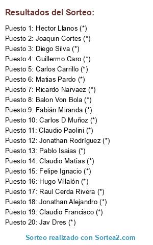 Lista de participantes: Claudio Matías (*), Joaquin Cortes (*), Jonathan Rodríguez (*), Matias Pardo (*), Hector Llanos (*), Raul Cerda Rivera (*), Felipe Ignacio (*), Claudio Francisco (*), Carlos D Muñoz (*), Hugo Villalón (*), Jonathan Alejandro (*), Carlos Carrillo (*), Diego Silva (*), Guillermo Caro (*), Jav Dres (*), Balon Von Bola (*), Ricardo Narvaez (*), Claudio Paolini (*), Fabián Miranda (*), Pablo Isaias (*).