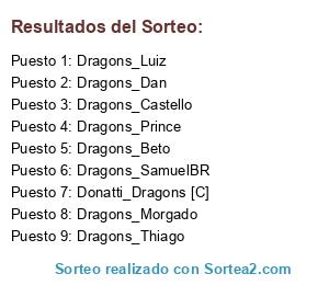 Lista de participantes: Donatti_Dragons [C], Dragons_Castello, Dragons_Dan, Dragons_Thiago, Dragons_Morgado, Dragons_Luiz, Dragons_Prince, Dragons_Beto, Dragons_SamuelBR.