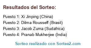Lista de participantes: Xi Jinping (China), Jacob Zuma (Sudafrica), Pranab Mukherjee (India), Dilma Rousseff (Brasil).