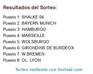 Lista de participantes: BAYERN MUNICH, MARSEILLE, OL. LYON, GIRONDINS DE BURDEOX, SHALKE 04, W.BREMEN, WOLSBURGO, HAMBURGO.