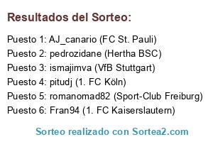 Lista de participantes: AJ_canario (FC St. Pauli), pedrozidane (Hertha BSC), pitudj (1. FC Köln), ismajimva (VfB Stuttgart), romanomad82 (Sport-Club Freiburg), Fran94 (1. FC Kaiserslautern).