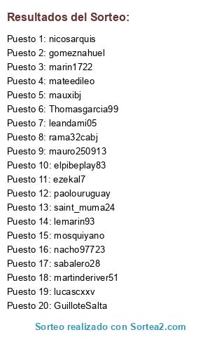Lista de participantes: lucascxxv, Thomasgarcia99, mosquiyano, nicosarquis, ezekal7, saint_muma24, martinderiver51, mateedileo, nacho97723, paolouruguay, elpibeplay83, marin1722, gomeznahuel, lemarin93, leandami05, rama32cabj, sabalero28, mauxibj, mauro250913, GuilloteSalta.