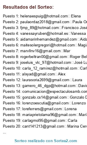 Lista de participantes: Email Address First Name , @adrian.herreros, @alex.rmr.93, @victoria03.jm, @martinezsanz.ines, @paulamartinezsanchez19, @femaneiz, @fr.marquesmoreno, @leticiamartinezperello, @andreachust, @andres3fm, @ccadbz, @jose--vlc, @mr4days, @pyroroca, @aegescorihuela, @osermu, @anafornas08, @gelabert.carlos, @n.gilabertnyc, @pablovaello, @jrdnarrola, @adferpre, @alumnosergiotomas, @rgll1992, @joansalvadorperezmari, @carol92_ms, @19jordi, @claaudiamartinez, @antonioalaquas, @claraag23, @beatrizlacueva, @paolapaula21, @bea_1988_, @marialh2315, @estherbr88, @carolinalopezalmenar, @diatomo, @adolfo.carratala, @Tormo.judith, @olivia_romero, @abortgar, @garcival, @adriancubillo12, @sinohaytantosgrados, @victorelputodios, @dusajor10, @albertocanacastillo10, @joseochan.jo, @jaferra1, @azur.17, @gabrilopezj99, @tomas.ador, @sariita1997, @rafaherreros, @pesiosa22, @isabelarenas1698, @natalia_arenas_97, @vicentemgf, @laracr96, @grodriguezbarajas, @martshui, @rubio.jrp, @aaldeagarcia, @nuriasantamans2000, @bgmanusan, @cvfrapero, @lpistoni, @bou179, @supermuflis, @monzon_q, @sara.navarro1999, @adriangarcia49, @cris25fs, @joseej9, @elgarvilunallena, @eloyescrihuelamena, @carlafuriosanz, @joserb95, @ajp98cs, @rafalazestruch, @aroa_argo, @guillegea9, @tonitala, @lurrio, @adri_moti, @chema-alonso, @dario_tona97, @serranomartinezalicia, @paulaortizalvarellos, @valerialerida, @beatriz816, @lugarfer1234, @marta.bellvers, @crissanz8, @rcabrmar, @raquelseguiro, @luciagarciaferreres, @raqueel.gl95, @silvia-jimenez, @odbassjazz, @pablof.9314, @lluisalandete, @herreros.alicia, @drac1974, @lunacli, @juanvicente.cav, @luisanro14, @marialopez19652, @espivi98, @jenifer_19917, @sarajk92, @xavi.10000, @jvboix, @santicardona89, @alicia_bojan, @fatirodriguez, @Cosyy.90, @juliacasan, @vaneds74, @javierdeesteban, @molinitass2, @cahimo.ch, @pabloortizblasco, @miguelangelranilla, @pepe.mislatasub, @angel_anp, @justbykevin, @javigarciavlc, @felguera89, @chema.simo.forment, @egibos, @carlospardopicazo, @andres_soriano, @maricruzm9, @mariaasensi, @ach97, @cristina9217, @bpomares7, @meneses_260585, @pejogaco, @pilarmoreno, @marinaolaso20, @portilla.jpr, @vandemia, @martariscoeres, @aruiperez90, @lauramarinaparicio, @anareyes_6_1_95, @julianjimenez, @alvarock74, @sara19911, @julian_gascon, @joantoledanoperis, @mariajo_bicho, @xavimasters, @ferran_6, @ruisugaivan, @isaac2at, @marrodriguezmartinez79, @paulamandingorra, @roiferradas, @alejandra1995_18, @emiliojose10_92, @ana_em26, @sento.mislatasub, @morenorierasara, @acy_77, @nataliaramirezvicent, @marinacampillomurillo, @lutecab, @english.deutsch.mail, @yonatalia19, @lidiagonroli, @pablorequena07, @alberto.ln, @alberto_ln, @rubbiales, @davidferrero9, @mofli.navarrete, @frablacu, @laterraroja, @gerardmingo, @nuria_cervero, @alfredo.cordero.sanchez, @martinezballesteros, @caspian131, @adriangadea69, @titasonia, @senseblau, @ivanglevante, @albavc.97, @aliramsel, @carmenark, @coral_jh, @elena_arapio1, @gelescont, @lauconco, @joseemilioboni, @jsierrapas, @josecalata1993, @stuntst75, @antonio6exto, @anavdm5, @lucialaserna22, @gg_nuria, @lauramartineznavarro85, @viictoor_1234, @anitssirkbb, @ihormar89, @si_mona_797, @carleta.borges96, @rebequita.15, @mesoj89, @patri_torrent, @quiquecq, @andrea.gil.r, @fredygpv, @pilar.miguel, @restosdecenizas, @miguel.sob.eng, @pablosolis.2293, @susanagbirlanga, @meri6c, @marietaalva, @jlmolinax78, @echaleku, @helenaespuig, @pilirupi, @jorgesanchezcastellote, @anaperezmarch, @jorgeribes, @verogm_87, @mirandaortizm1, @garfer8.sergio, @albasp_10, @requena.ana85, @nachogimeno99, @blanca19sena, @hoyoapariciomarilia, @noemi_ruozsoldevila, @saraforner21, @jorgeortizbono, @sararuizalfonso1007, @ruben95rodrigo, @enricahis, @kiikkoo_ci, @joseluis_vlc_97, @mariamparo.roca, @elenaribera92, @inesgilselva7, @mmv1job, @laura.abenza.barbera, @perfumobas23, @martitaorange20, @oscartalaveraduran, @alexruizmilla, @napripa_97, @samuelholden, @sonialuque98, @marta_311995, @rubengonzam, @leonconmac, @iciarrp, @marinamoreno997, @edgardomenechgarcia, @fabi_difulvio, @pablolgsw, @bnsancho, @rosmyr3, @zaida_gisma, @rubo_9696, @eloylte, @laurasoria2699, @guille_vidal2, @anarblas93, @alhena86, @arantxabelenguert, @titonasser271090, @annallario, @ignacioderypol, @silvi.es, @natalieta18, @martinoperezolga, @virmaror9, @oscarveratomas, @rosaestevanhernaiz, @rosamariahernaizaparicio, @arimb92, @maajo46, @anabelguillemtormo, @fotografo, @anays_ruiz, @david.bcn.210, @emilio, @ferrersanchezandrea, @manoloesther, @carlosmartireal, @sofiafeme1, @veronicamv89, @nahezrol, @tamarads115, @silvia.alejandro.campos, @juanjuhe, @juliajfp98, @angeladazalopez, @juliaferris98, @maria_471, @lorenatoribiosoriano, @jorgecliment, @serrranoficial, @jaimeguaita_golf, @j.polomiller29, @jesusfuentesvalls, @fofidita, @pabzamar, @maijorme, @jo_jorge16, @pb_son, @beatriz26_m, @jessicamaria_55_, @cristina_98_9, @adrianbermudez999, @bortizbernal, @pilicandel30, @himeko.ai, @juanjopalomar20, @waser_ruben, @leonardo.easd, @yanixiavega, @estefanyazul, @dariart94, @paularubio1, @saezcebria, @enavarroburgal, @anaballesteros5, @anaesplugues, @alberto.ramirez.losilla, @marta.1633, @maria_artana, @Claudia.arroyo.arribas, @pizarromaria396, @sandraaparisi, @nomevalacuenta, @ernesto.e.y.94, @luismi220589, @isa.consuelo7, @andreamj202, @maitesolergregori, @tito_robert_3, @rubengarcia.rgh, @danielaibarpruebas, @josepllauri, @raul-morales, @silvieta_corbera, @javiparrabonet, @rociobibs, @sanfelixvalladolid, @sarary_dreams, @amaya.cardin, @mfaubelmartinez, @joanet4_92, @alibe.3792, @mirodpon, @paulagdp, @cristinavarre5, @mariagomezdelpino95, @carlitosvalverde98, @vicvite92, @frankdogo10, @asanr39, @trigosi, @abelcrdb, @mjosemedina, @sofiaousmoi, @chelo-gandia, @davidakermp, @marcomorateresa, @adrix_81, @rociofb21, @yazminarc, @blanlosan, @paulita__97, @dani31898, @gemmamartinez1998, @pastorj.jp, @delreyargos, @anita_500, @aaronfernandez286, @victoryago92, @aroldia, @angelblink, @javi_lokuras19, @b.garcia.carlos,