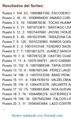 Lista de participantes: 2 23 10073073393 AGURTO FRIAS YANERY HELEN, 2 28 10041905919 ALEGRIA CHIPANA LIZ ZARA, 2 83 10074830748 AMAYA MONTOYA CAROLINA, 2 484 10008901450 ARIAS LESCANO ANTONIA JUANA, 2 37 10043083156 AYLLON ROMO VANESSA KARINA, 2 298 10008128095 BRAVO VERAMENDI JUANA MARIA, 2 100 10009694225 CHUNGA ACOSTA MILAGROS, 2 1 10075783818 CRUZ ENEQUE GUSTAVO MARIANO, 2 449 10010232043 FLORES SALAS GLADYS VANESSA, 2 80 10008923284 HUAROTO JIMENEZ LIDIA MARILU, 2 347 10008951034 JAVIER GUANILO CLARA MAGDALENA, 2 14 10008948698 JUNCHAYA APARCANA DE CORDOVA MARIA DEL PILAR, 2 20 10009348333 MENDOZA ALFOY CARLOS MANUEL, 2 22 10074413149 MENDOZA FLORES CARLOS MARTIN, 2 18 10074176198 MENDOZA VASQUEZ PAULINA ELVIRA, 2 39 10043435571 PINTADO CHUNGA DENISSE TERESA, 2 111 10009686121 SANCHEZ RAMOS MARIBEL ERIKA, 2 24 10045220378 VILLANUEVA MEDINA MIGUEL ANGEL, 3 9 10009118869 ACEVEDO BALTAZAR DE ROJAS JULIA FELICIA, 3 76 10008872008 AGURTO MENDOZA TEODORA MARIA, 3 1 10041734675 ALARCON GUTIERREZ MADELEINE BRISCELA, 3 61 10006307212 ANGULO OQUENA DE IPANAQ MARIA ESTHER, 3 57 10022514810 AYALA HUAMAN DE RIVERA DORIS ISABEL, 3 3 10047145268 BARDALES LOMAS MARGOTH, 3 1 10070939238 BECERRA TORRES DIANA, 3 15 10047547309 BUSTAMANTE HURTADO ROBERTO CARLOS, 3 15 10042249014 CARBAJAL BECERRA WALTER CAMILO, 3 63 10072539676 CASTILLO GARCIA YANIRA NOELIA, 3 33 10047327090 CASTILLO RUESTA LUIS ANGEL, 3 43 10044103039 CASTRO JANAMPA JULISSA, 3 1 10070932471 CORDOVA JIMENEZ FRANCES JANIS, 3 189 10008932281 CORDOVA LLERENA MARLENE DEL PILAR, 3 0 10070172063 DAVILA PRECIADO NICOLE, 3 28 10071279281 DE LA CRUZ SALAZAR ANY CANDY, 3 16 10009284490 DELGADO ARIAS OBDULIA FELICITAS, 3 55 10046145293 ESPINOZA GUTIERREZ LILIANA SUSANA, 3 0 10070605766 ESPINOZA TRUJILLO ANA LIBIA, 3 45 10010233516 ESTRADA VICTORIA RAQUEL ELVIRA, 3 144 10040124541 GALLEGOS RAMOS JOSE LUIS, 3 207 10008929390 GARCIA PECHO DE LOPEZ MARITZA ELENA, 3 25 10044626050 GROVAS GUTIERREZ MARIA ROSARIO, 3 2 10040840415 GUADALUPE MEDINA JORGE LUIS, 3 76 10044890276 GUTIERREZ ROSAS DE AYACA ZOICA MERCEDES, 3 24 10071009155 HINOSTROZA HUAIHUAS NAYELI SELENE, 3 0 10042957957 HUERTA NARREA MARTIN ADAN, 3 73 10008392480 LA TORRE MESIAS HILDA MARIANELA, 3 66 10040740185 LAZARTE LAPA KAREN, 3 11 10040453684 LAZO CONTRERAS LUIS ALEX, 3 32 10072639438 LOPEZ YTO NAYSHA MARIA, 3 88 10019259641 MANRIQUE CERDAN NORMA LINDAURA, 3 10 10041900835 MARIN MESTANZA EDITA, 3 9 20002987075 MARQUEZ HERNANDEZ JULIA GRISNEL, 3 3 10047048901 MENDOZA DELGADO PAMELA YOLANDA, 3 26 10074714171 MENDOZA HUARANGA JACKELINE ALEXANDRA, 3 8 10008908867 MENDOZA SANTA CRUZ APOLONIA, 3 180 10007708633 MORI RUIZ DE MACEDO EDITH ELIZABETH, 3 83 10010593035 NEYRA RAMON DAYSI MIRTHA, 3 482 10009681243 PORRAS MIRABAL MARIA SOLEDAD, 3 11 10040998988 PRADO BECERRA PETER JHON, 3 10 10073148955 QUISPE MAMANI EDITH GIOVANA, 3 82 10008898211 RAMIREZ CORREA AMABLE, 3 92 10010592534 RAMIREZ PENA MOTIVOS PERSONALES AMEIIA, 3 21 10008944593 REFORME SANJINEZ DE RODRIGUEZ ESTHER VIRGINIA, 3 58 10008918743 REGALADO DIAZ DE PERICHE VILMA NANCY, 3 9 10073783234 RIOS PEREZ NELLY MARINA, 3 174 10041225503 ROMERO RODRIGUEZ VICTORIA ELVA, 3 28 10009290027 RONDON TELAYA HUBERT JUAN, 3 89 10007298843 SAAVEDRA REATEGUI MARIA LILIA, 3 4 20003229175 SALGUERO LARA ZAIDA VICTORIA, 3 358 10008914145 SALVATIERRA ALVARADO FIDENCIA, 3 35 10009246098 SANCHEZ ANCHANTE JESUS GUILLERMO, 3 42 10042614814 SANDOVAL MUNOS MARIA ESTHER, 3 2 10073832573 SANDOVAL PEREDHAVIZ ANGELA GABRIELA, 3 21 10010753811 SANTIAGO LEANDRO NORIS RICARDINA, 3 45 10010237085 TARAZONA CARRASCO DE RUIZ ALICIA LITA, 3 3 10010103148 TENORIO SACRAMENTO ELISA, 3 115 10008909484 TRUJILLO LUQUE DOMITILA, 3 6 10024384408 VALENCIA LUQUE JULIO CESAR, 3 3 20002335912 VASQUEZ SALGUERO LINAIRIS ARNAY, 3 11 10009687220 VERGARAY MAYS OLGA LUZ, 3 43 10071305617 VILCAPOMA PASACHE YESSENIA DEL MILAGRO, 3 219 10010234093 W & V NEGOCIOS Y SERVICIOS S.A.C ., 3 22 10044541115 ZAPATA CANAZAS ANDY JUNIORS, 3 57 10046498188 ZAPATA CHOQUEHUANCA GABRIELA INES, 4 9 10076413176 ALFARO GARCIA MARIBEL, 4 2 10041670862 ESCURRA RUIZ JULIANA MARCELA, 4 32 10008893137 FERNANDEZ ZAPATA ELSA ROSARIO, 4 85 10043724807 GALLARDO LOCONI BRIGITT DEL ROCIO, 4 17 10043113403 GAMBOA BARRIENTOS MARGARITA, 4 6 10009232782 GARCIA CHACON CIRA ALINDA, 4 1 10028840394 GARCIA FERNANDEZ MARIA MAGDALENA, 4 215 10009287191 GOMEZ SULUCO SILVIA, 4 68 10009712049 HUARCAYA LEON VILMA, 4 20 10008920033 LOAYZA PALOMARES VIOLETA ESCOLASTICA, 4 17 10046616085 LUCAS LOPEZ JUNIOR IGNACIO, 4 330 10010595612 MAZA FU#O NESTOR, 4 44 10009685167 QUINE GAMARRA VIRGINIA EVA, 4 2 10010592176 RAMIREZ RAMIREZ JOHN RUBENS, 4 7 10009691445 RUIZ HUAPAYA SILVIA GUISELA, 5 1 10049051679 AGUILAR ESPINOSA SONIA CRISTINA, 5 11 10047559320 BORDA BARRERA EDDY GERMAN, 5 1 10048124708 CORDOVA ESPINAL YESSENIA ANALY, 5 1 10073875513 ECHEVARRIA AUQUI JULIO CESAR, 5 14 10080501929 GUERRERO YATACO JOSE WILMER, 5 137 10006640861 HURTADO VALDERRAMA ROSA ELBA, 5 105 10008989423 LAIME HUAMANI ROSA VICTORIA, 5 0 10008923551 LEVANO VALENCIA HERMINS ROGELIO, 5 107 10008897407 RAMIREZ PONCE JULIANA, 5 123 10042248359 RATACHI ROJAS ALINA LUZ, 5 16 10009287316 SALVATIERRA FERRO SIMON FIDEL, 5 10 10008876036 TOCAS HUAMAN MARIA CIRA, 5 10 10009690940 VALDEZ GONZALES ERICA MARIANA, 6 0 20023641175 OVIEDO MARRERO EIBER, 7 1 10072450075 ACOSTA QUIROZ DALIHA ESCARLET LUANA, 7 3 10041732649 AGUAYO LOPEZ ROSSI WENDY, 7 3 10045645130 ARANA CASAS JHON ANDY, 7 94 10043758982 ARTEAGA QUIJANO JOHANNA LIZETH, 7 2 10072843553 AYALA COTRINA BRUNO IRAN, 7 0 10008940958 CABRERA BALLON ROSA, 7 19 10046757996 CALDERON QUINTANA IVONNE VANESSA, 7 111 10009104082 CAMISAN CANO AMELIA, 7 6 10070972228 CASTRO CUADROS VALERY YOSIRA, 7 31 10046628349 CASTRO PALIZA RAUL ERNESTO, 7 34 10045505553 CHERRES SALSAVILCA DENNISSE ROSARIO, 7 176 10007703376 CIEZA SEGURA DE GONZALES ROSS MERY, 7 57 10046351930 FLORES HUARACA MIRIAM, 7 1 10047561069 FLORES HUARACA SANDRA RUFINA, 7 2 