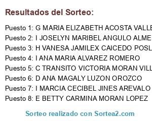 Lista de participantes: A BIBIANA VERONICA JIMENEZ LITARDO, A DIANA KATHERINE SIGCHO VEGA, A ELSA LILIANA CANTOS GUERRERO, A GEOVANNA KAREN AREVALO SARCO, A ISABEL FRANCISCA MONTES CHICHANDE, A KARINA CECILIA CHILA MORAN, A MERY CONCEPCION ZUÑIGA GODOY, A YADIRA MAGDALENA MOSQUERA PINCAY, B CARMEN VICTLRIA PEÑA ALCIVAR, B DOLORES MERCEDES LOPEZ ASENCIO, B ESTHER ALEXANDRA MOSQUERA BAJAÑA, B EVELIN INES SILVA LEON, B IVONNE ELIZABETH ESCALANTE FARIAS, B JENNIFER VANESSA DIAS FIALLOS, B JOSELYN LISSETTE CESEN ANDRADE, B LISSETH STEFANY VALLADARES RIQUEIRO, B MARJORIE TATIANA ESPINOZA MOREIRA, B PAMELA FERNANDA SOLIS FUELA, B PRISCILA GIOMARA GUZMAN NUÑEZ, B VIVIANA ESTEFANIA JARA VASQUEZ, C ANA MARCIA CAÑAR BARAHONA, C ANA VICTORIA PALACIOS PACHECO, C CECILIA PAOLA CAMACHO PINELA, C DIANA CAROLINA ORTEGA GONZALEZ, C ELENA VALERIA RAMIREZ VILLAMAR, C GENESIS SHULAY VILLEGAS GOMEZ, C INGRID LILIANA SANTILLAN GAVILANES, C JESSICA FAVIOLA GOMEZ REYNA, C KARINA CAROLA CASTELO CUYANGUILLO, C LISBETH ANDREINA RAMOS MARURI, C MAYRA NARCISA ALDAS POVEDA, C NANCY MOSQUERA JIMENEZ, C NORMA AMADA CONTRERAS HOLGUIN, C ROSA BELINDA SOLORZANO ALVARADO, C SOLANGE MILDRED MORALES MORALES, C TRANSITO VICTORIA MORAN VILLAMAR, C VIVIANA DE LOS ANGELES OÑATE SORIANO, D ANA MAGALY LUZON OROZCO, D GISELA ESTELA PAREDES MIRANDA, D GUILLERMINA DEL ROCIO ARGUDO GOMESCOELLO, D KARINA GISSELA PAREDES ZAMBRANO, D NINFA LEONOR CARRERA LLANOS, E BETTY CARMINA MORAN LOPEZ, E DANNA GABRIELA DOMINGUEZ RAMOS, E GILDA CAROLINA TORRES CHURTA, E GISELLA GABRIELA MANZO MURILLO, E MARIA DEL CARMEN CENTENO RAMOS, E MARIA DE LOS ANGELES FLORES POZO, E MERCY FILADELFIA PLAZA RUIZ, E PEDRO LUIS HARO VILLARREAL, E ROSA JOHANNA CORDOVA PEZO, E SAMANTA ROXANA MACHOA AGUINDO, E SHYLEY VIVIANA VALERO MUÑOZ, E YANINA DEL ROCIO MORA ANCHUNDIA, G ALISSON ANDREA ROJANO LARRAGA, G ANTONIA NATIVIDAD ORTEGA GUERRERO, G BETTY ELINORY CEDEÑO MENDOZA, G GEORGINA JULIETA MUÑOZ MUNOZ, G GILDA ISABEL GONZALEZ CRUZ, G IVONNE JAZMIN SOTO LOPEZ, G JESSICA JADIRA CISNEROS RIVAS, G KEILA PAOLA PICO VILLAVICENCIO, G LIDICA ESTHER ARCE ORTIZ, G MAIRA CECILIA BENITES VILLALVA, G MARIA ELIZABETH ACOSTA VALLEJO, G MARIANITA DE JESUS CASTRO MONTES, G MARJORIE AMPARO VITERI CONTRERAS, G MARTHA ELIZABETH FIGUEROA FLORES, G MIRNA JAZMIN CALLE CEREZO, G NADIA BRICEIDA CONFORME MOLINA, G NANCY MARILU PALACIOS GOMEZ, G NANCY MARIUXI SALINAS CRUZ, G RUBI MARIBEL MOSQUERA GUAMAN, G TATIANA RUSSIBEL MANOBANDA MACIAS, H ANA CAROLINA MARTINEZ BRIONES, H DAYANA ISABEL CRUZ NAVAS, H EDWIN RODOLFO LOOR ESPINALES, H GEOMARA MAGALY RAMOS MORA, H JAZMIN MARICELA RIOS ALVAREZ, H JESSICA ELVIRA PERALTA MAGALLANES, H KENYA VANESSA LOPEZ MERA, H MARIA LUISA OBANDO ARANA, H MARICELA DE JESUS PACHECO TROYA, H MARTINA DEL ROCIO SANCHEZ GARAICOA, H PRISCILA GINA RODRIGUEZ VIDAL, H SILVIA PATRICIA MURILLO CARPIO, H TANIA ALEJANDRA LOOR CALAPINA, H TATIANA DE JESUS SALAZAR RODRIGUEZ, H VANESA JAMILEX CAICEDO POSLIGUA, I ANA MARIA ALVAREZ ROMERO, I ANA MARGARITA ESPINOZA ARTEAGA, I ANGELA CLEMENCIA VIDAL PEREZ, I DIANA CECIBEL ORTIZ JIMENEZ, I GABRIELA RUTH CHAVEZ ORDOÑEZ, I GABRIELA FERNANDA SALAS ALVARADO, I JOSELYN MARIBEL ANGULO ALMEIDA, I KAROLINA ELIZABETH BRAVO BRIONES, I LIDA MARIANA DAMIAN ESTRADA, I LIDA CORINA GUERRERO PEÑAFIEL, I LOURDES SOFIA CEDEÑO JARA, I MARCIA CECIBEL JINES AREVALO, I MARIA NARCISA AVALOS GUALLPA, I MARIA ISABEL CHUSAN CORTEZ, I MARIA ISABEL NARANJO SUAREZ, I MARIANA DE JESUS BALLADARES OLMEDO, I MERCEDES AMPARO OÑATE PINOS, I MIRIAN MARJORIE GUERRERO ROMERO, I OLGA JOHANNA HERNANDEZ ALVARADO, I SILVANA ESTEFANIA ARAMBULO GOYEZ.